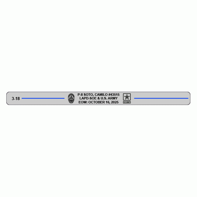 Bracelet will come bent Photo not yet available 7" x 1/2" Stainless Steel Bracelet Etched text and Blue etched line P-II SOTO, CAMILO #43515 LAPD-SOE & U.S. ARMY EOW: OCTOBER 16, 2025 Badge and American flag 3-18 at end found in |